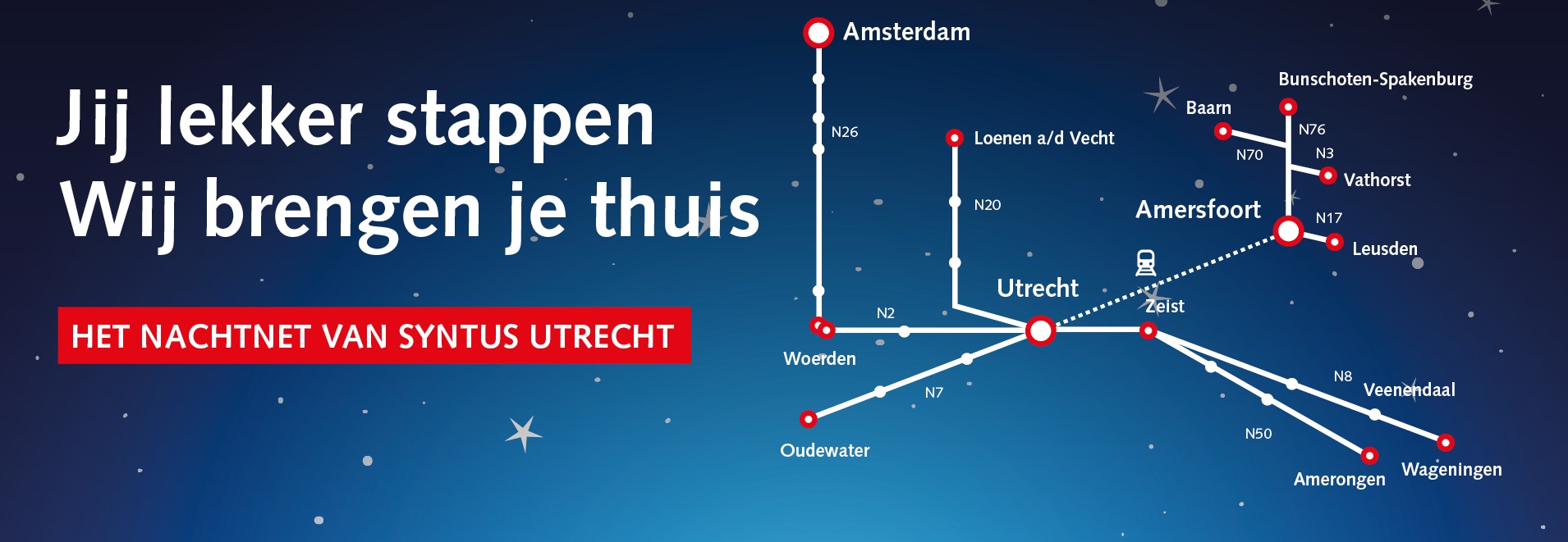 Vanuit Utrecht rijdt de NS met nachttreinen naar Amersfoort. Onze nachtbussen in Amersfoort sluiten aan op deze nachttreinen.