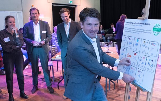 Vijftien Utrechtse partijen hebben donderdag 7 oktober samen met de gemeente en de provincie hun handtekening gezet onder het stadsakkoord ‘Utrecht voor iedereen toegankelijk’. Dat geldt ook voor Syntus Utrecht. Het doel van het stadsakkoord is om de stad beter toegankelijk te maken, doordat de aangesloten partijen gezamenlijk verbeteringen doorvoeren. Van deze verbeteringen gaan voornamelijk Utrechters met een beperking echt iets merken. In 2021 en 2022 onderzoeken wij o.a. samen met vervoerders NS en U-OV de knelpunten bij de informatievoorziening voor reizigers met een beperking.